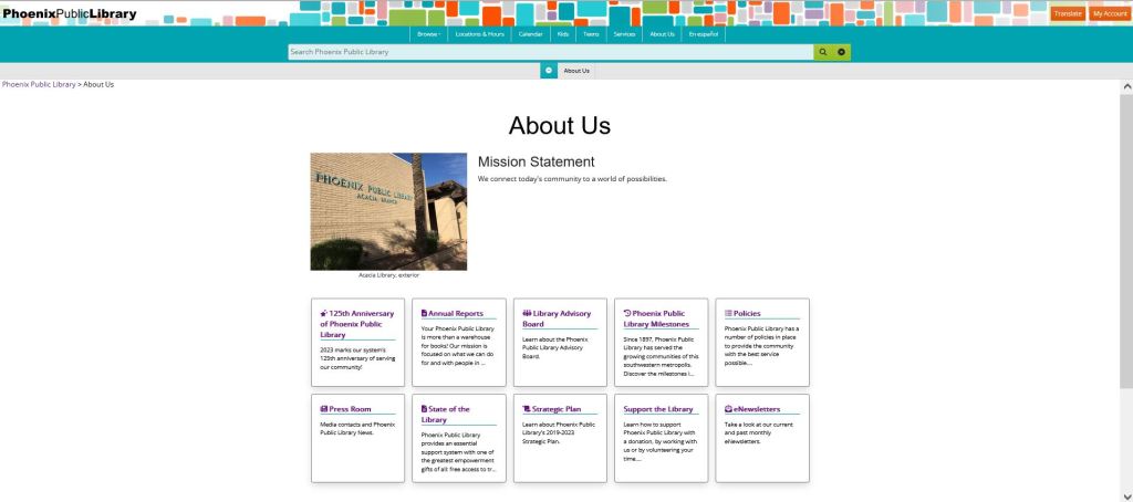 The City of Phoenix has a government website which lists mission statements for many of its core programs. And if you look under the library section of that site, you find a complete mission statement for the Phoenix Public Library including helpful links throughout the text and an explanation of many core library policies.