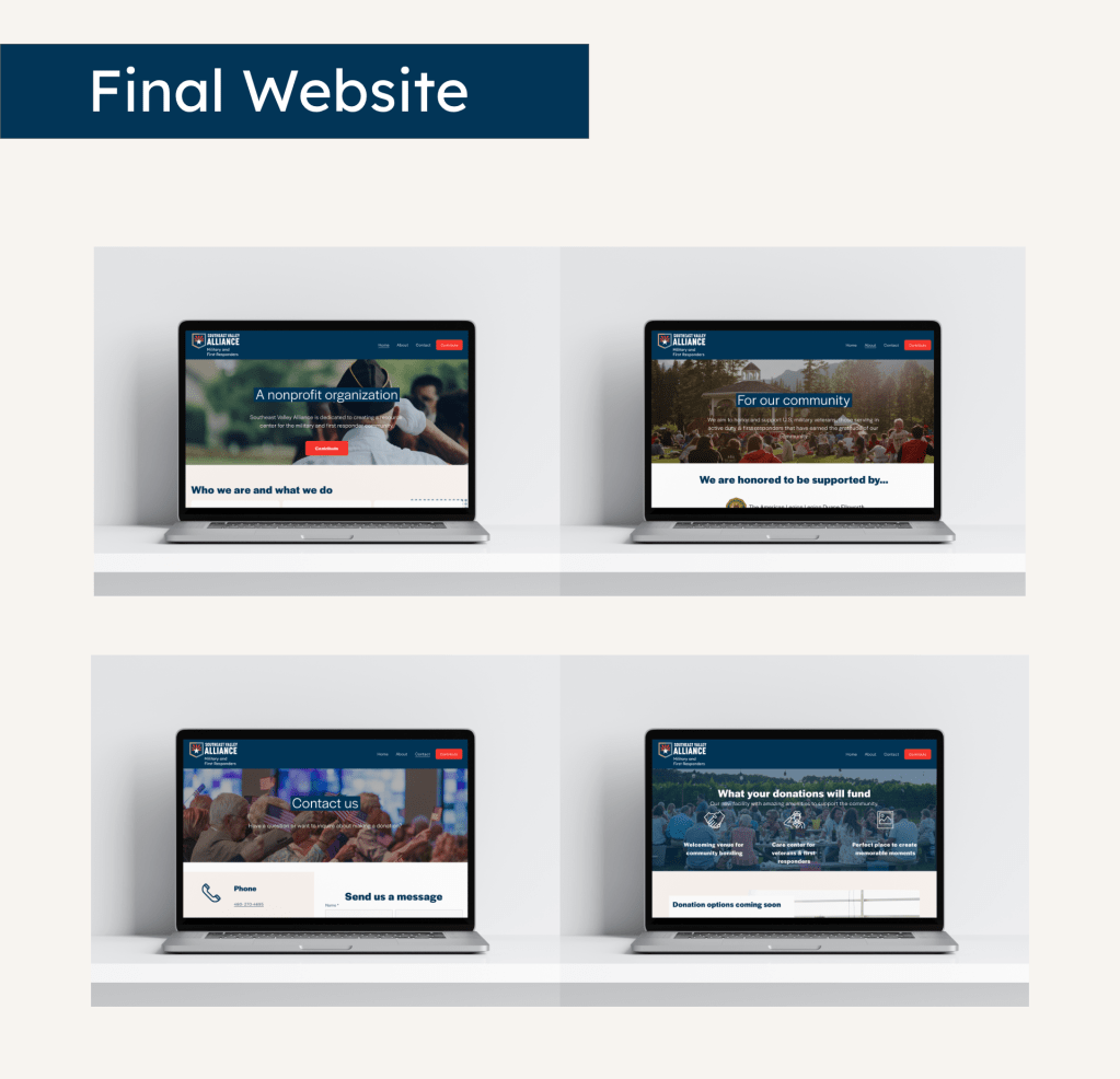 The previous team from the Agency had created branding and initial prototypes of potential webpages. We performed UX research and testing of that branding/mockups and used the data to refine our prototypes. Then, after incorporating client feedback, we created the website in Squarespace and integrated it with Donorbox donation management software.